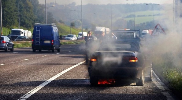 Bezprostředně po zastavení se musíte co nejrychleji dostat do bezpečí. Oblečte si reflexní vestu a opusťte vozidlo. Všichni cestující by měli co nejrychleji vystoupit a vzdálit se do bezpečné vzdálenosti, ideálně za svodidla, pokud se nacházíte na dálnici nebo frekventované silnici. Poté je nutné okamžitě zavolat na tísňovou linku 150 nebo 112 a nahlásit požár vozidla.