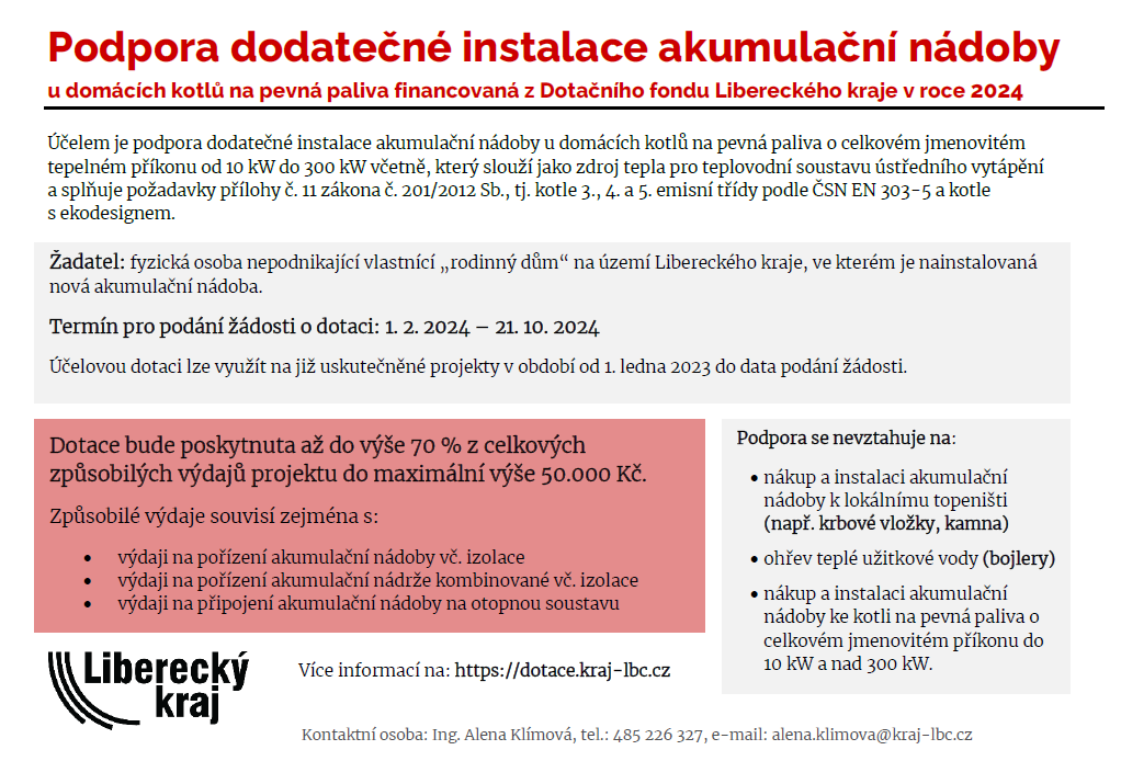 Žadatelem v tomto programu může být fyzická osoba nepodnikající, která vlastní rodinný dům na území Libereckého kraje, v němž je instalovaná akumulační nádoba.