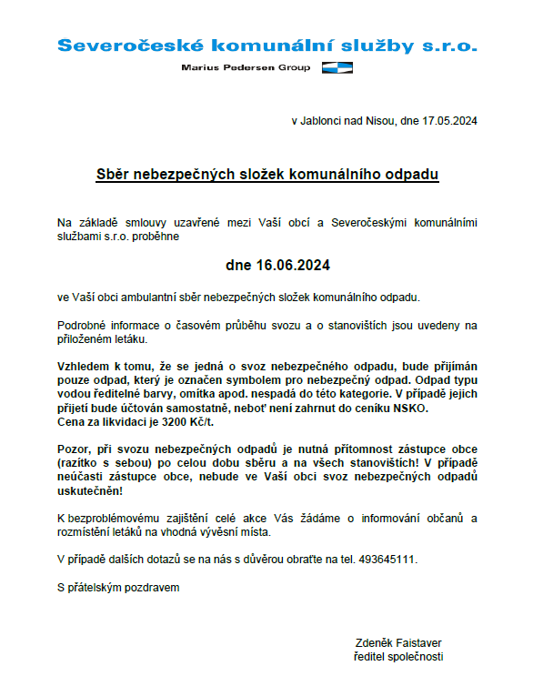 Sběr nebezpečných složek komunálního odpadu dne 16.06.2024